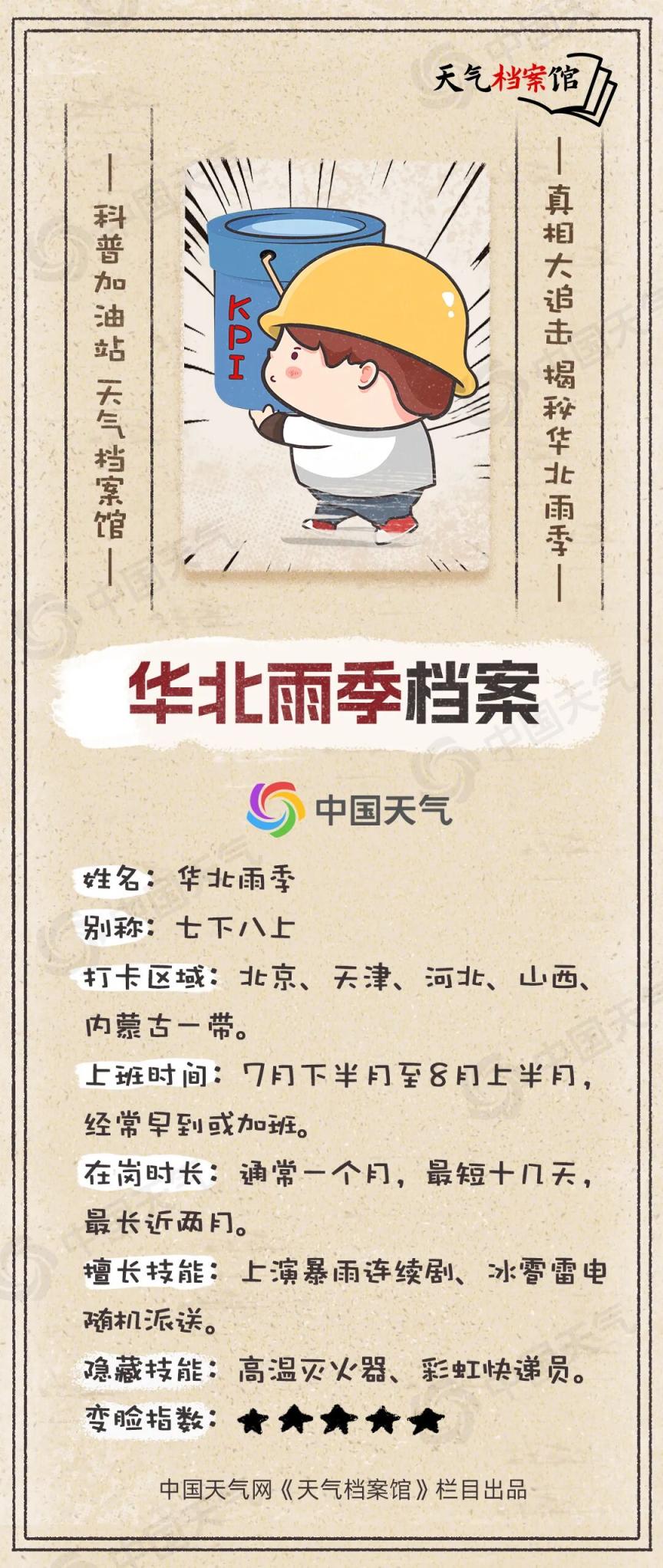 大家好,我是华北雨季,一个背负华北地区降雨KPI的“打工人”。江湖人送外号“七下八上”,因为我的常规上岗时间为每年七月下半月到八月上半月。不过,这年头干啥都讲究“内卷”,我们雨季圈也不例外,早到晚退、加班干活那是家常便饭。