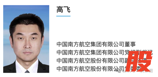 公开资料显示,高飞飞行出身,1976年8月生,北京航空航天大学飞行学院飞行技术专业毕业,中山大学岭南学院工商管理专业硕士学位、美国麻省理工学院管理学研究专业理学硕士。曾任南方航空飞行管理部副总经理、南航深圳分公司副总经理,南航集团安全监察部总经理,南方航空飞行总队总队长、党委副书记等职。